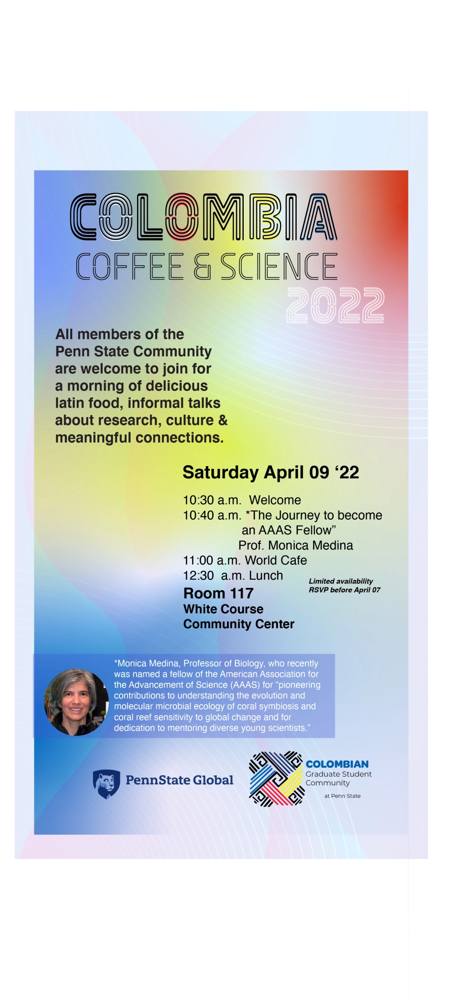Through the Cultural Storytelling series, we aim to bridge the gap between past and present, culture and science, personal and professional. By sharing these powerful stories, we hope to ignite a passion for exploration and discovery, fostering a deeper understanding and appreciation of the rich heritage and remarkable achievements of the Penn State Colombian Graduate Students Community.