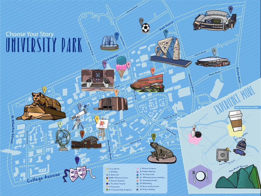 Design Goals: To develop a creative and engaging map that provides alternative activities for Penn State University students, encouraging them to explore options beyond alcohol consumption. The map aims to promote healthy, fulfilling, and diverse activities that contribute positively to students’ well-being, academic success, and social experiences.